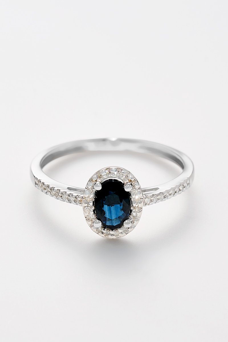 Materiali: oro bianco 375, diamanti 0,1 kt/32 e zaffiro 0,74 kt/1