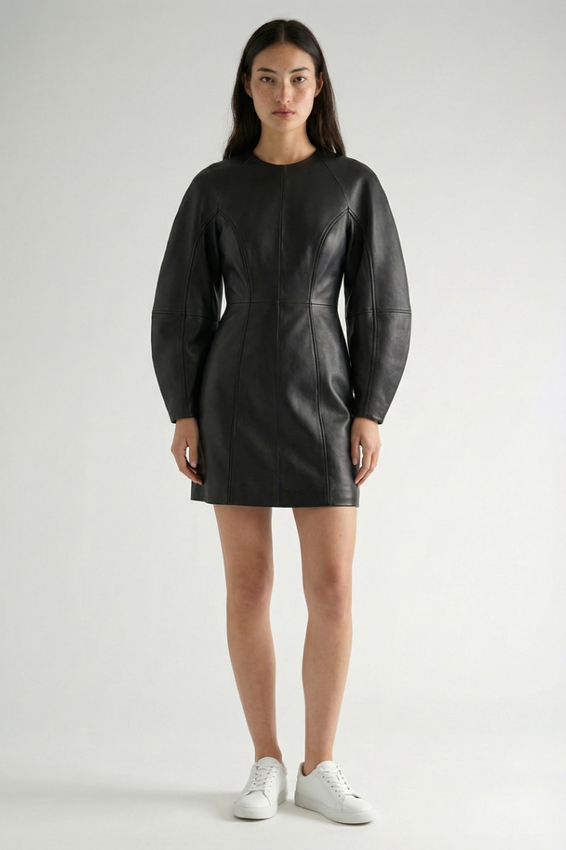 Abito taglio dritto in pelle con maniche lunghe a palloncino.