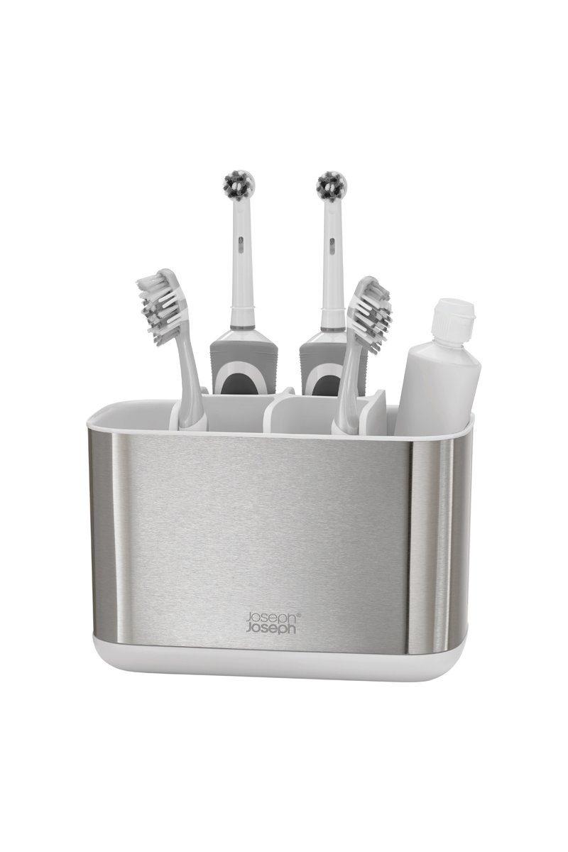 Questo porta spazzolini di grande formato è suddiviso in diversi scomparti per organizzare i prodotti per l'igiene orale come spazzolini tradizionali, elettrici, tubetti di dentifricio e filo interdentale in modo ordinato.