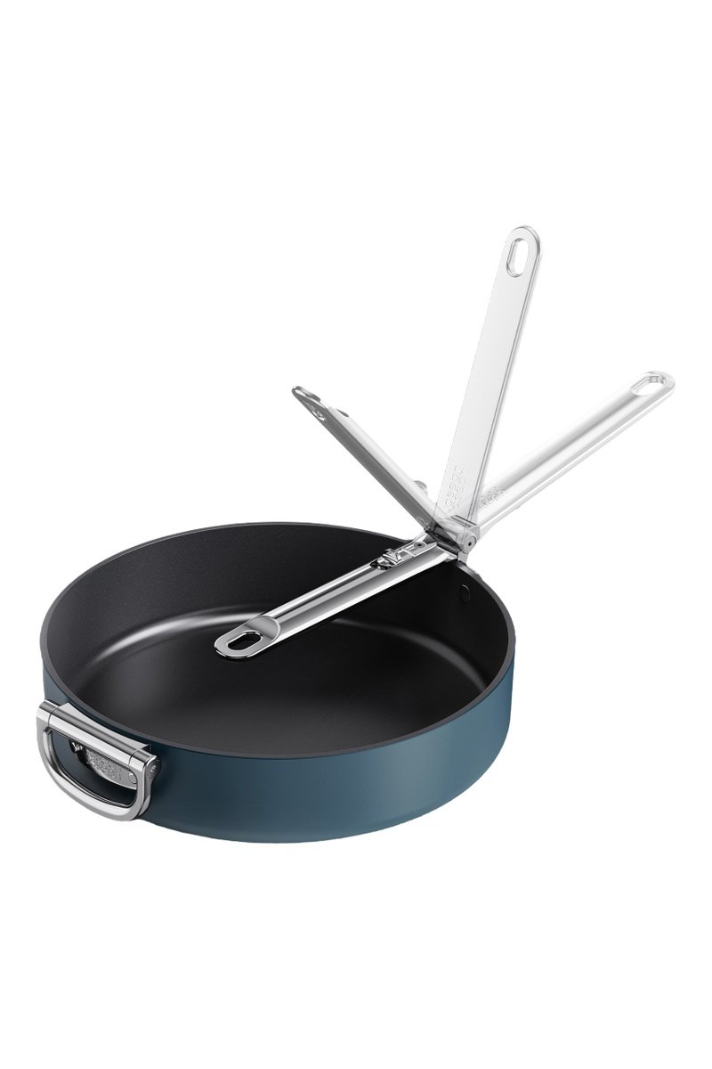 Dotata di un'astuta maniglia pieghevole in acciaio inossidabile che consente di risparmiare fino al 50% di spazio in più rispetto a una padella standard quando riposta.