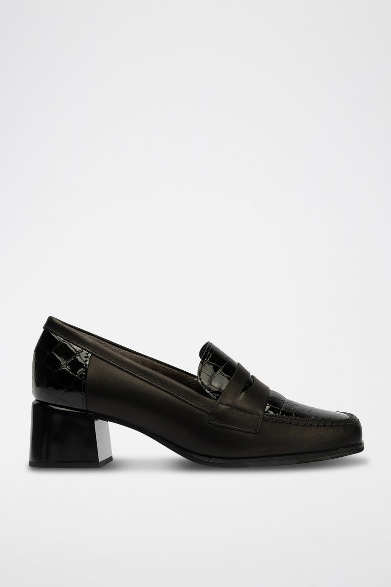 Mocassini con tacco in pelle nappa e pelle verniciata.