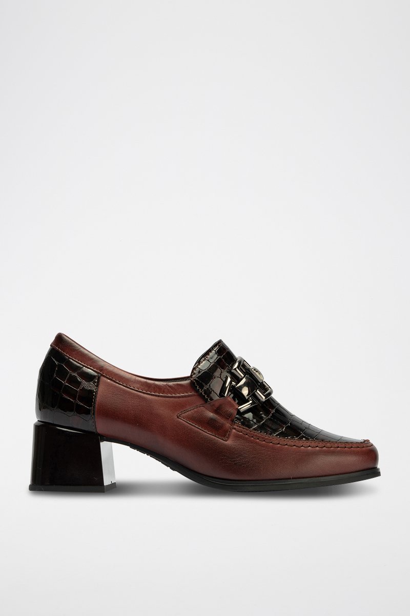 Mocassini con tacco in pelle nappa e pelle verniciata.