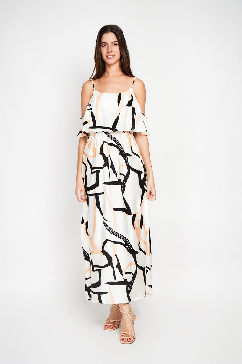 Abito lungo in lino - Arancione, bianco e nero