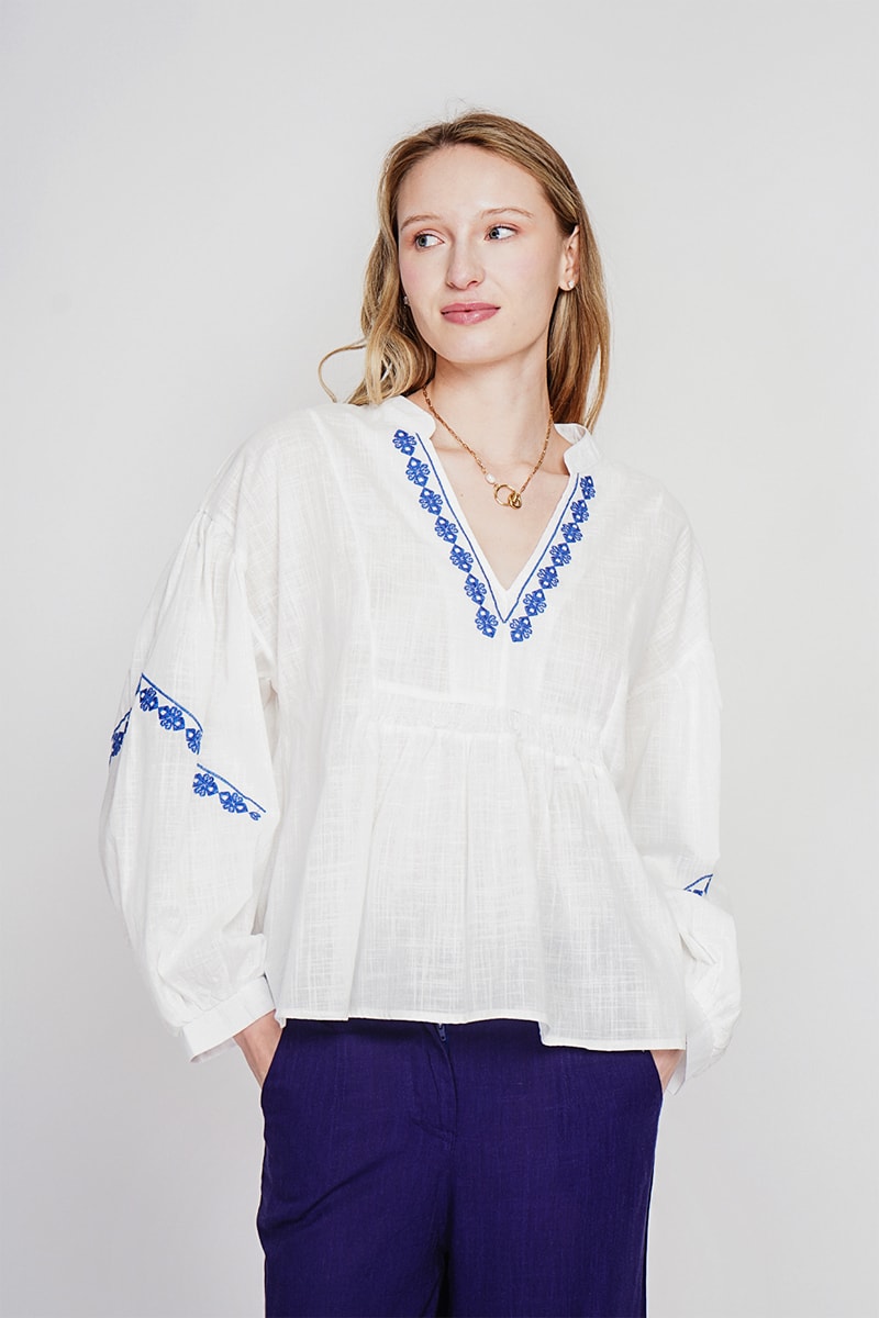 Blusa in lino - Celeste - Bianco