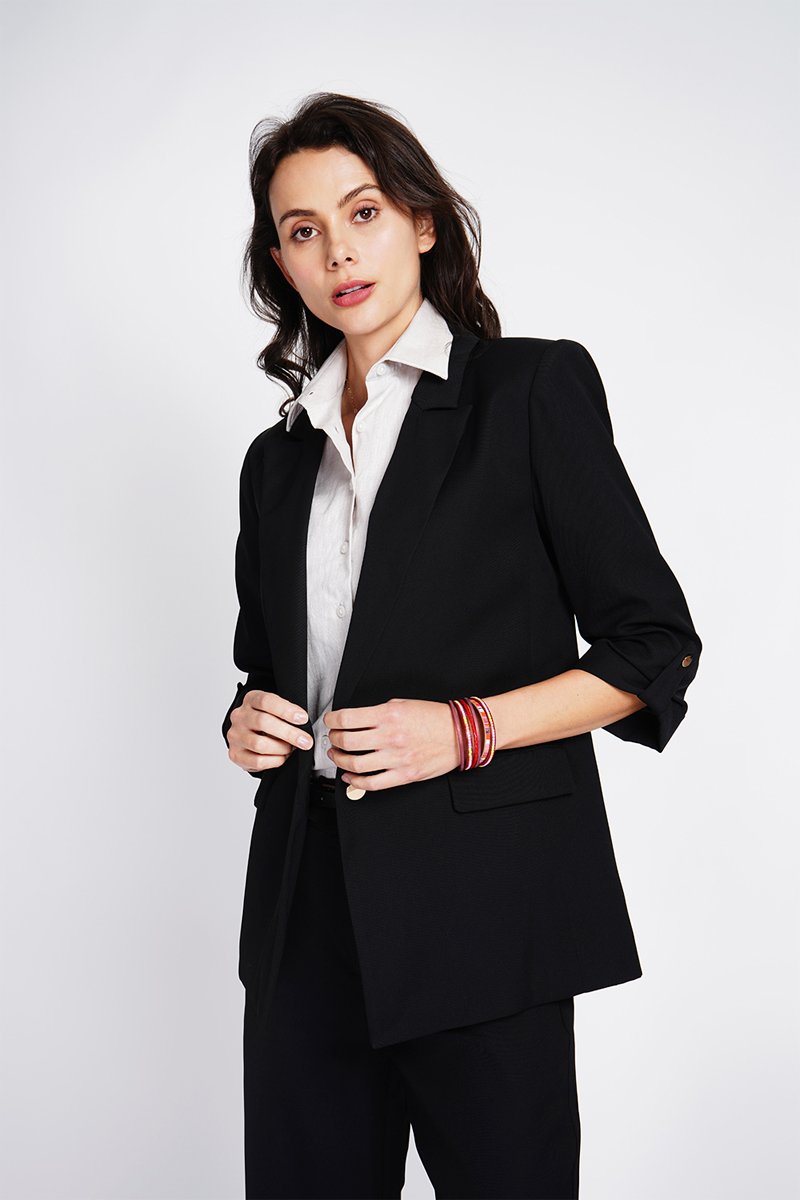 Giacca con maniche a 3/4 rimboccabili con linguetta abbottonata.