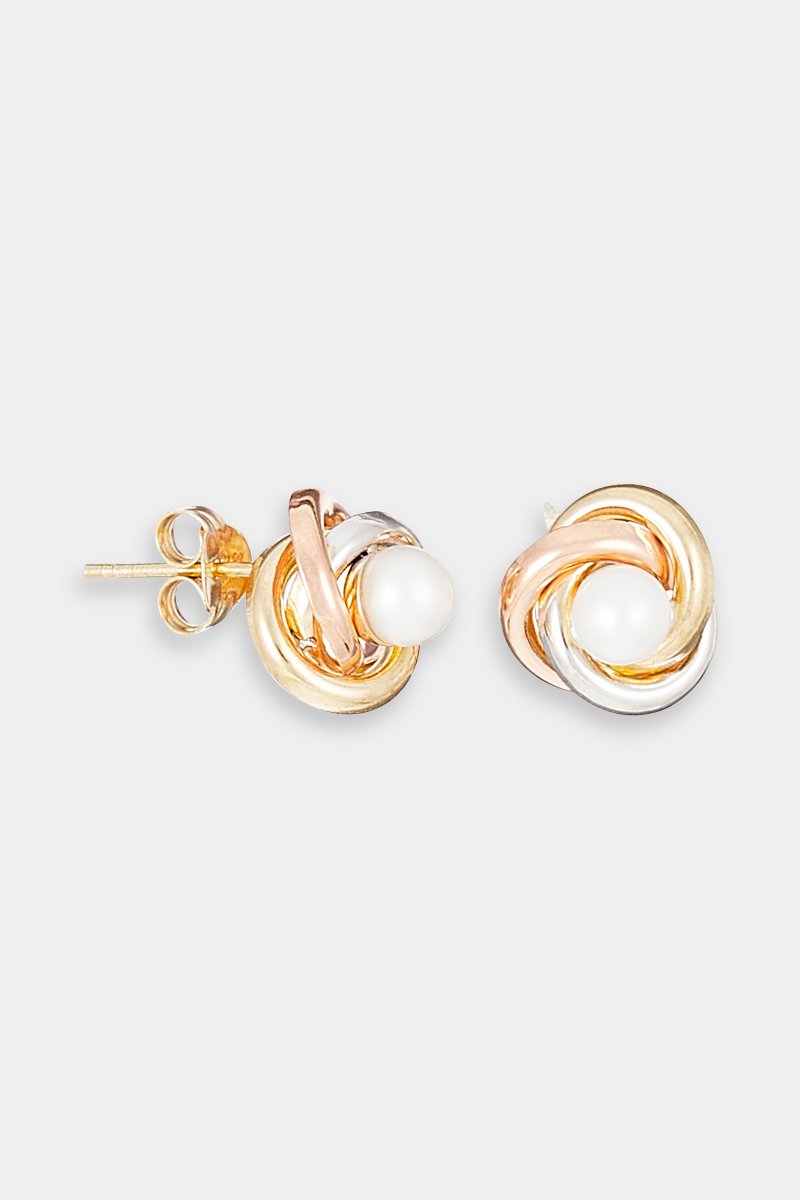Orecchini in oro giallo, oro rosa, oro bianco con una perla coltivata.