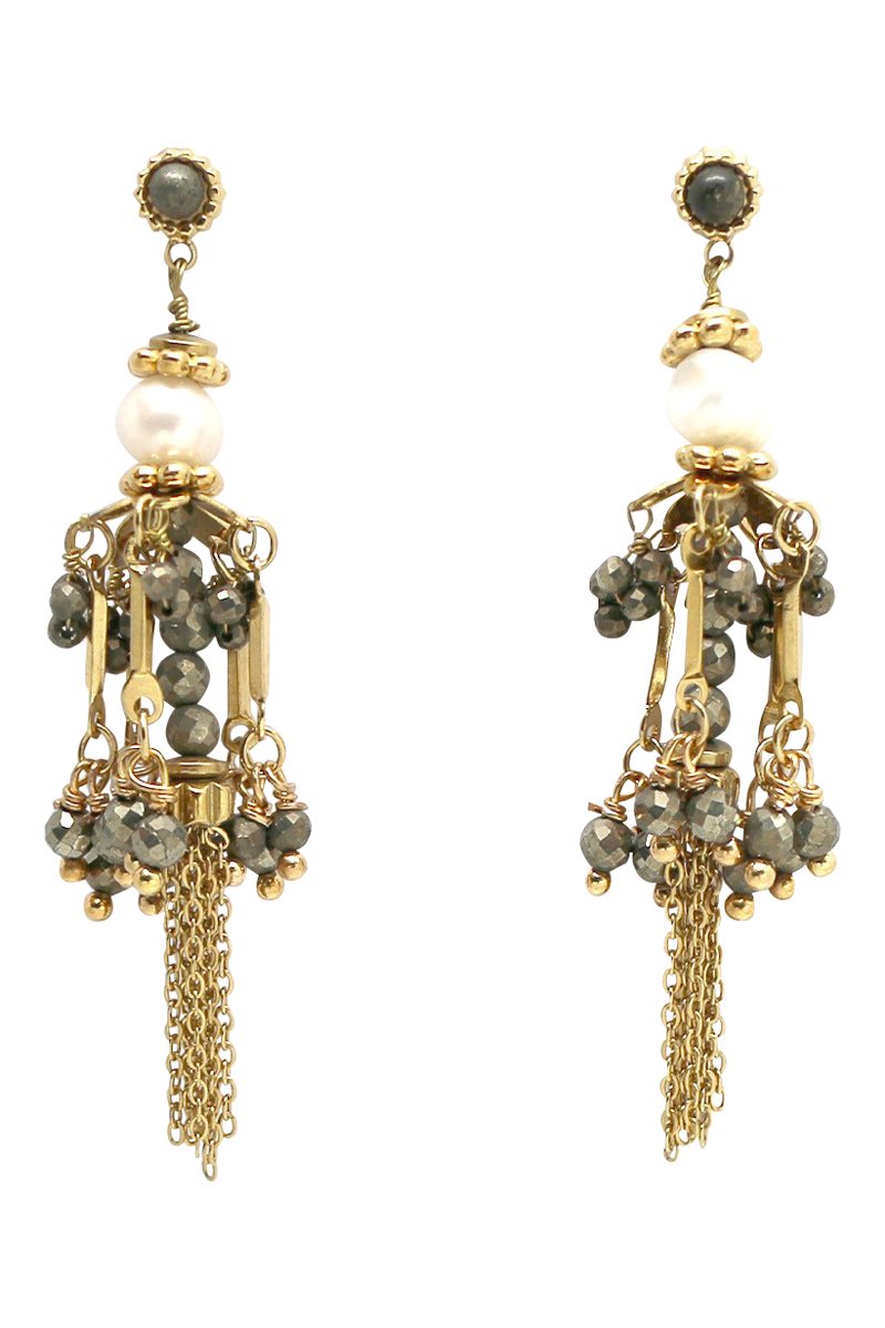 Orecchini pendenti con piriti e una perla coltivata d’acqua dolce.