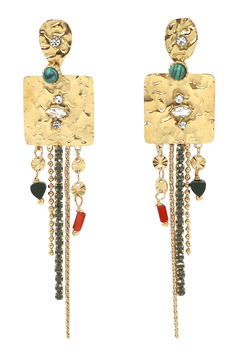 Orecchini pendenti con cristalli e un’onice.