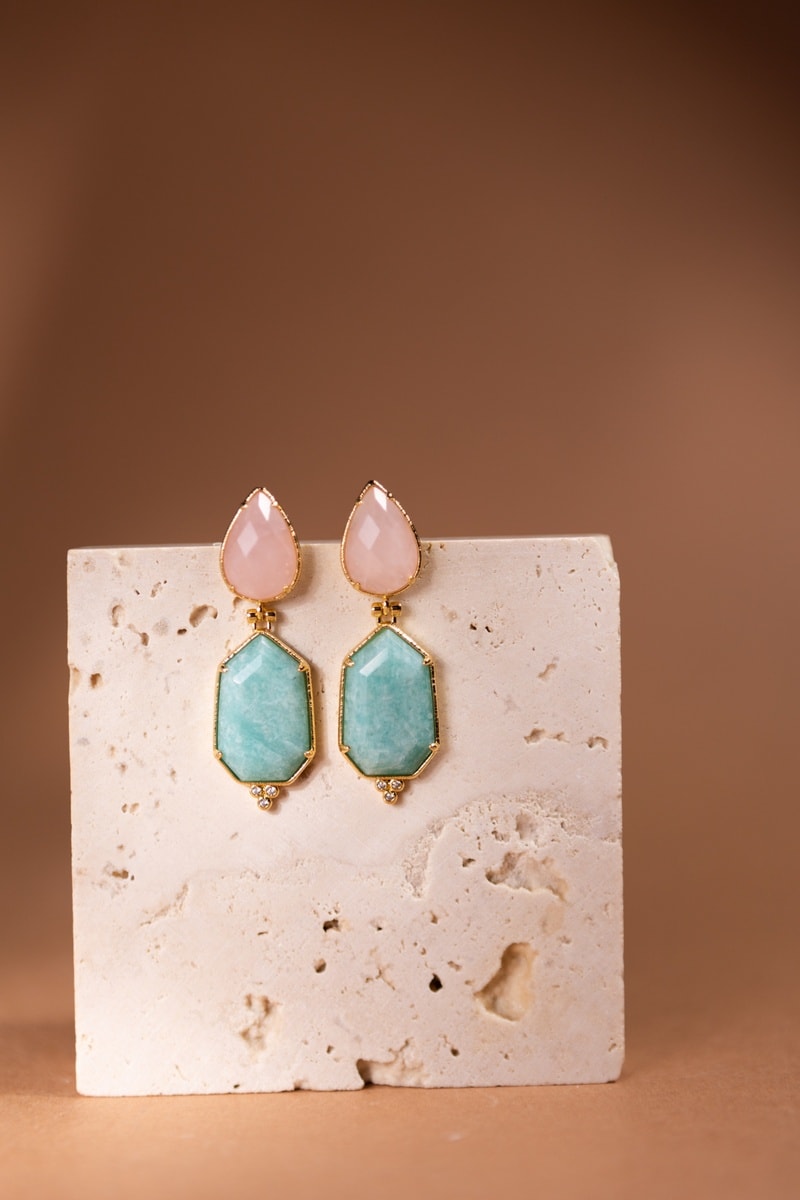 Orecchini pendenti laminato oro fino giallo con un quarzo e un’amazzonite.