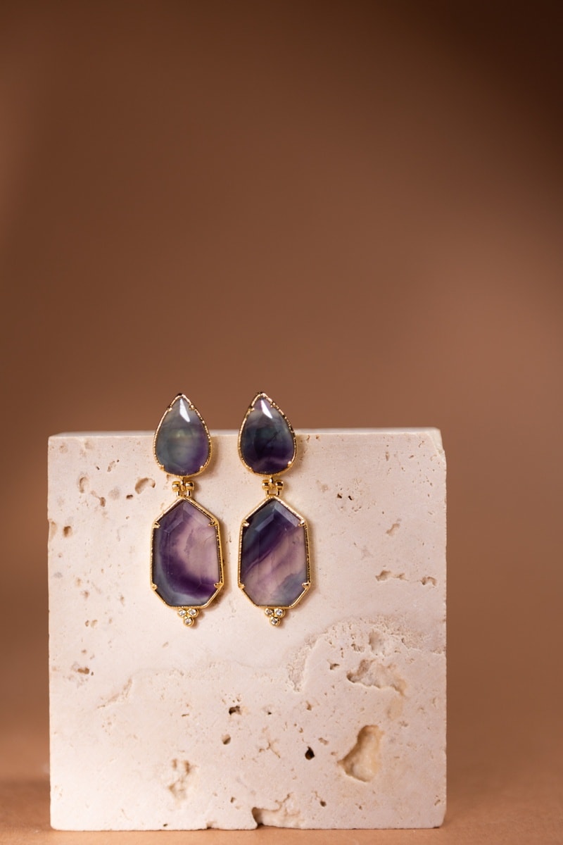 Orecchini pendenti laminato oro fino giallo con una fluorite.