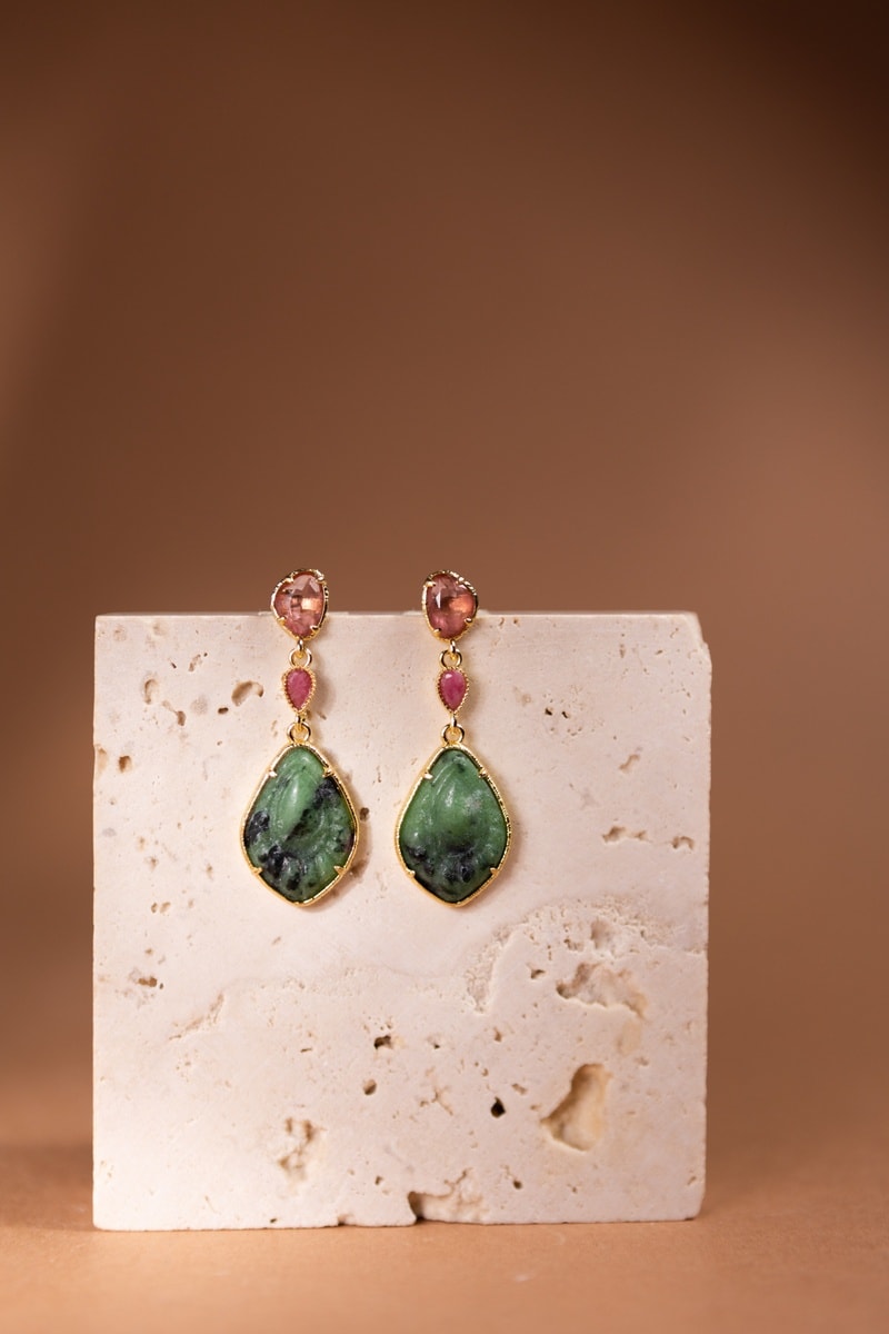 Orecchini pendenti laminato oro fino giallo con un rubino, una tormalina e uno zircone.