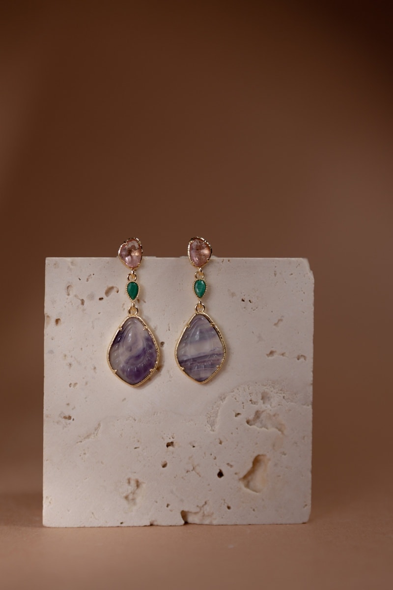 Orecchini pendenti laminato oro fino giallo con una fluorite, una malachite e uno zircone.