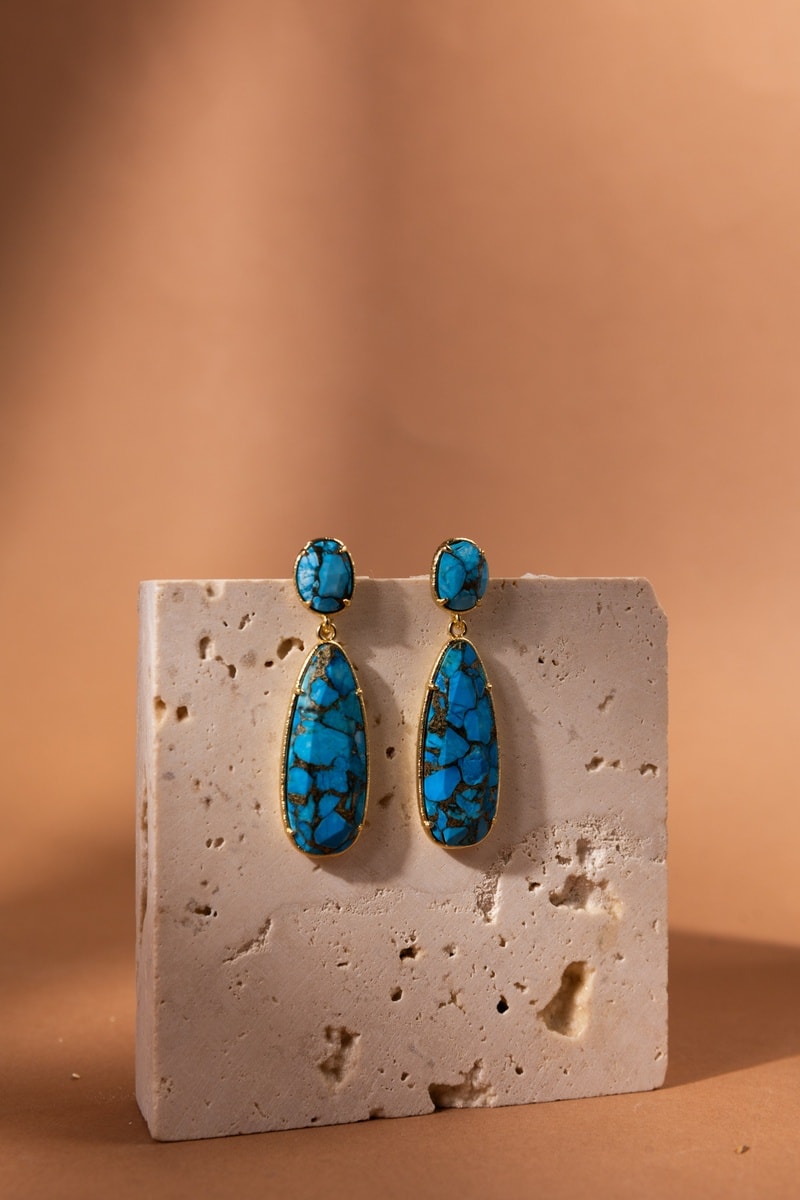 Orecchini pendenti laminato oro fino giallo con 2 turchesi.