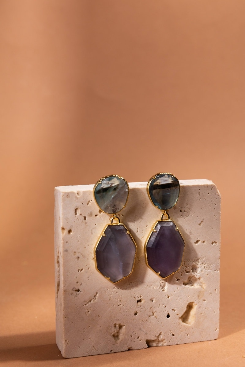 Orecchini pendenti laminato oro fino giallo con 2 fluoriti.