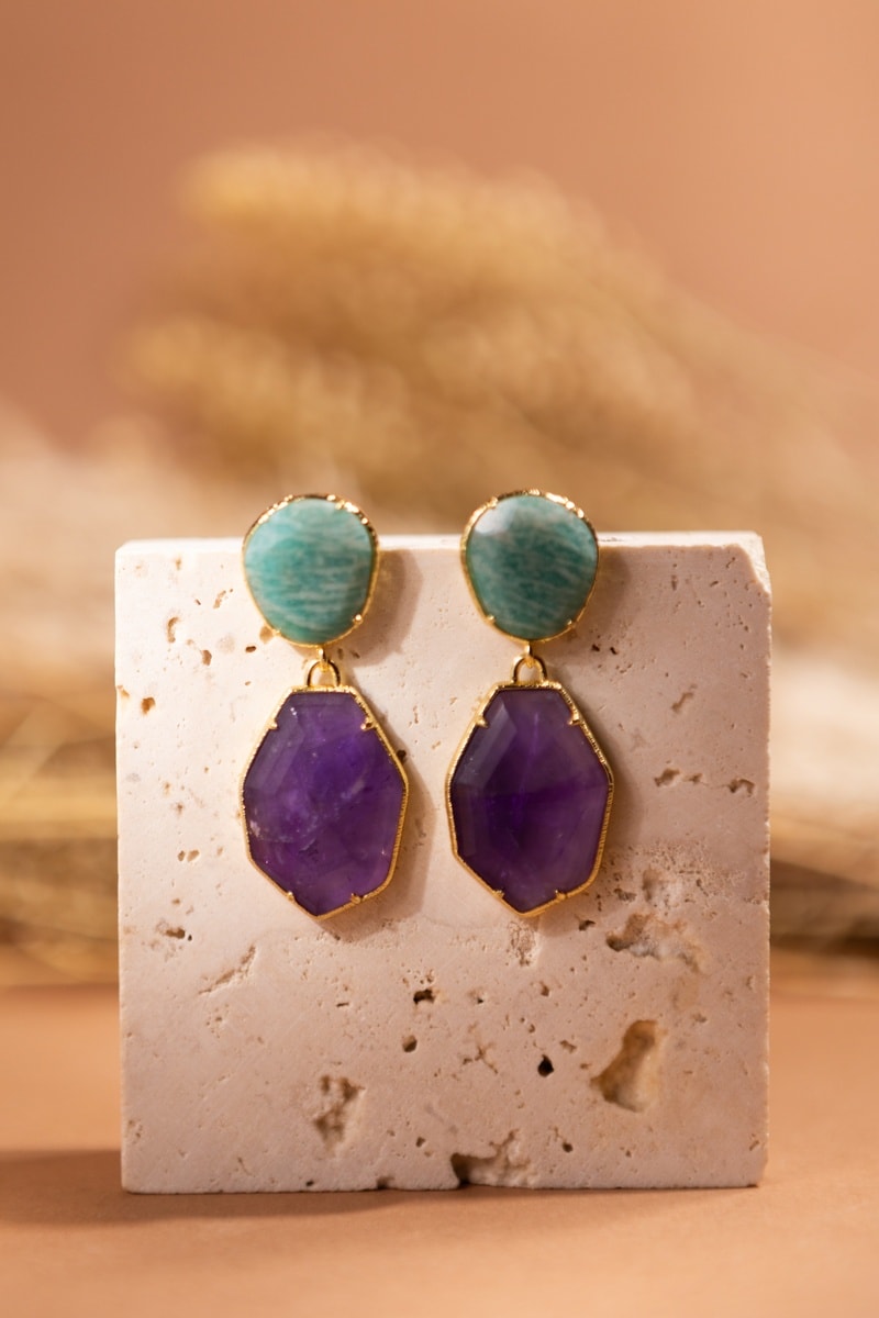 Orecchini pendenti laminato oro fino giallo con una fluorite e un’amazzonite.