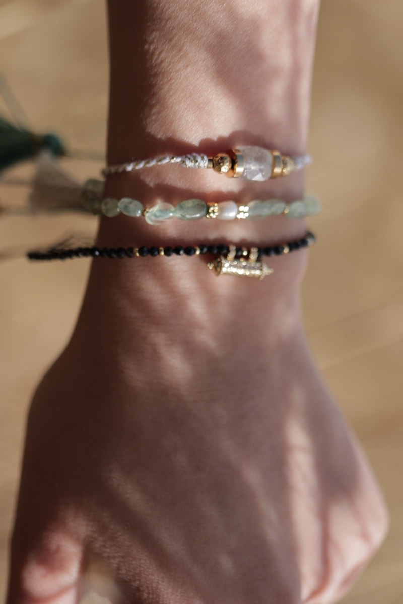 Bracciale con prehniti e una perla coltivata d’acqua dolce.