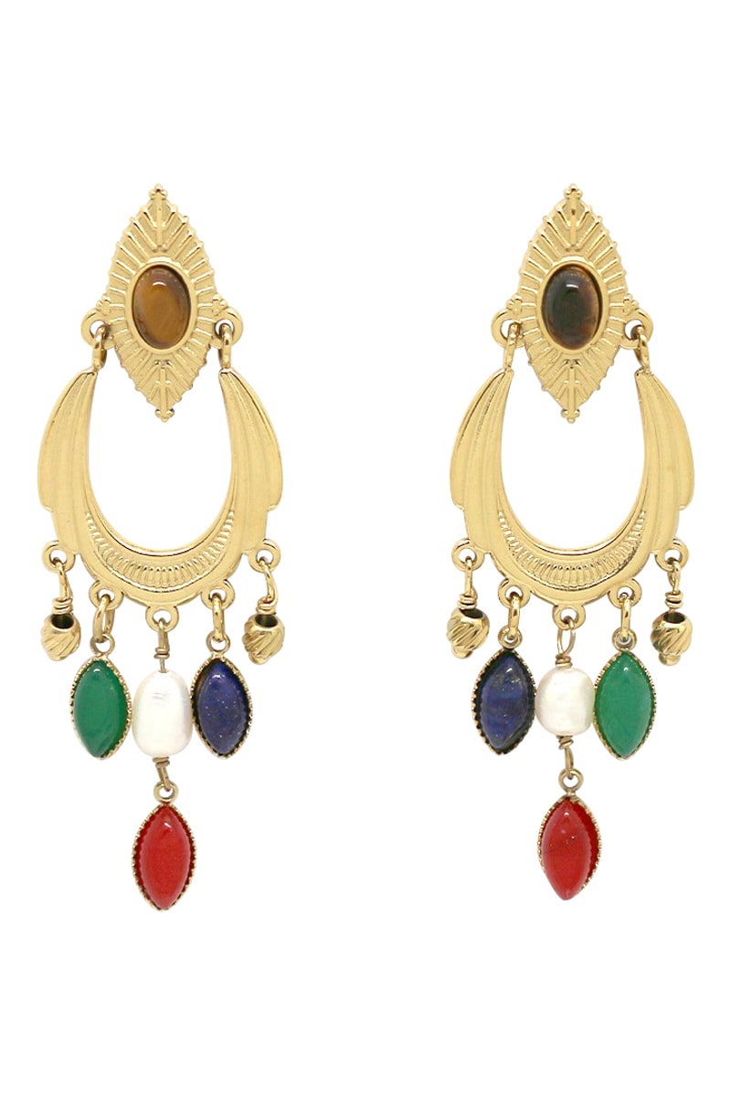 Orecchini pendenti con un occhio di tigre, 3 agate, un lapislazzuli e 2 perle coltivate d’acqua dolce.