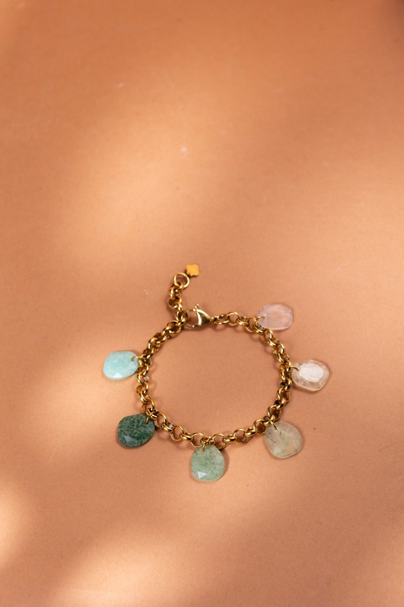 Bracciale con 2 quarzi, 2 amazzoniti, un rubino zoisite e una prehnite.