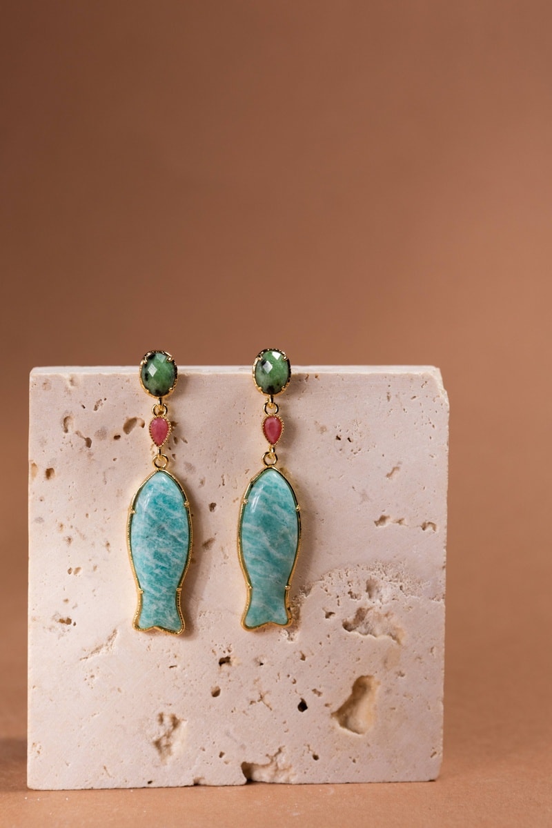 Orecchini pendenti laminato oro fino giallo con un’amazzonite, un rubino zoisite e una tormalina.