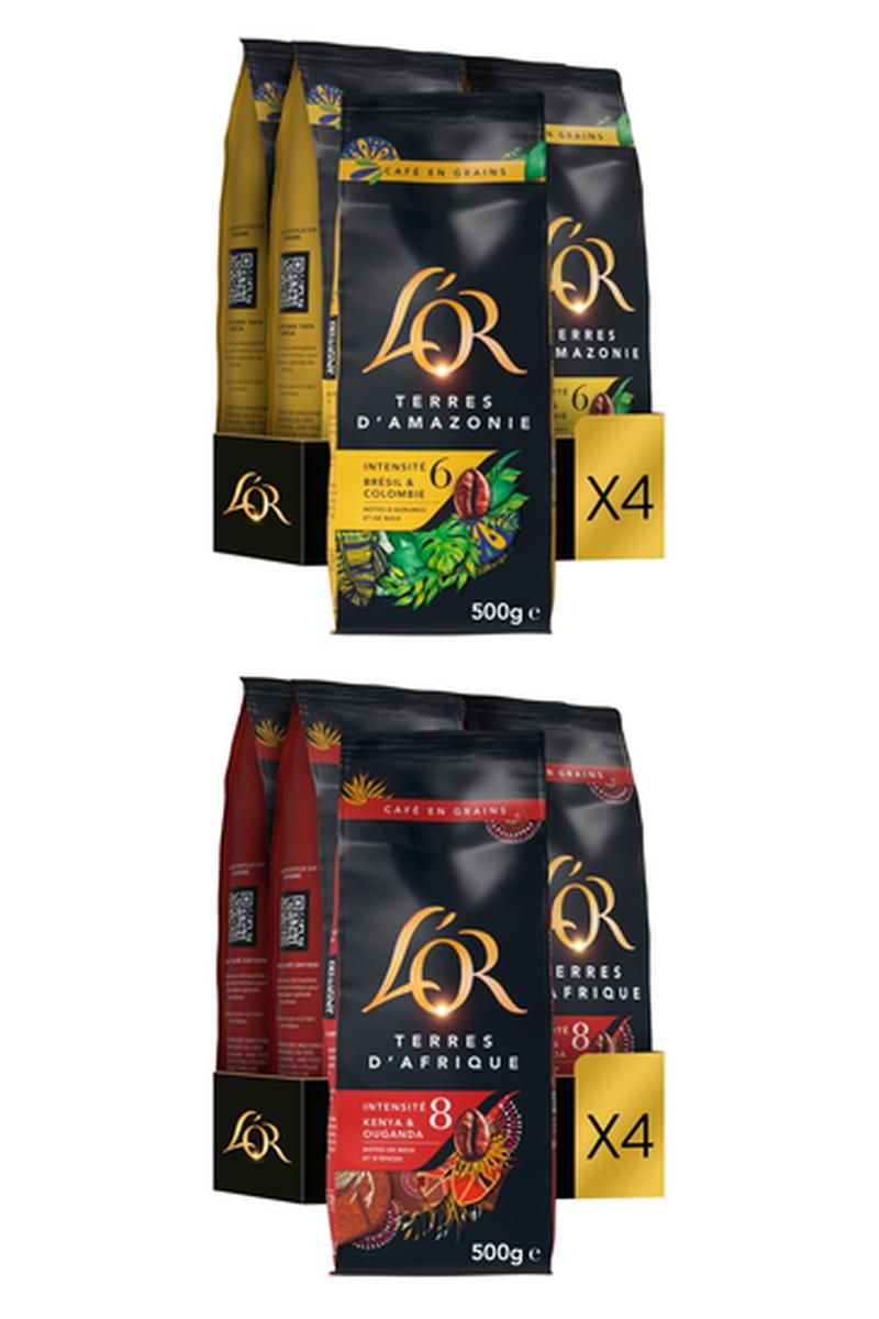 4 x 500 g - Caffè in grani L'Or Terres d'Amazonie - Intensità 6 + 4 x 500 g - Caffè in grani L'Or Terres d'Afrique - Intensità 8