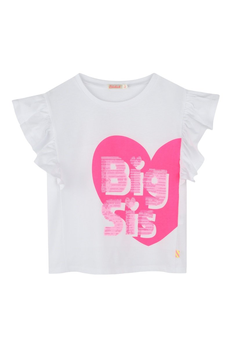 Scritta con paillettes e motivo cuore sul davanti.