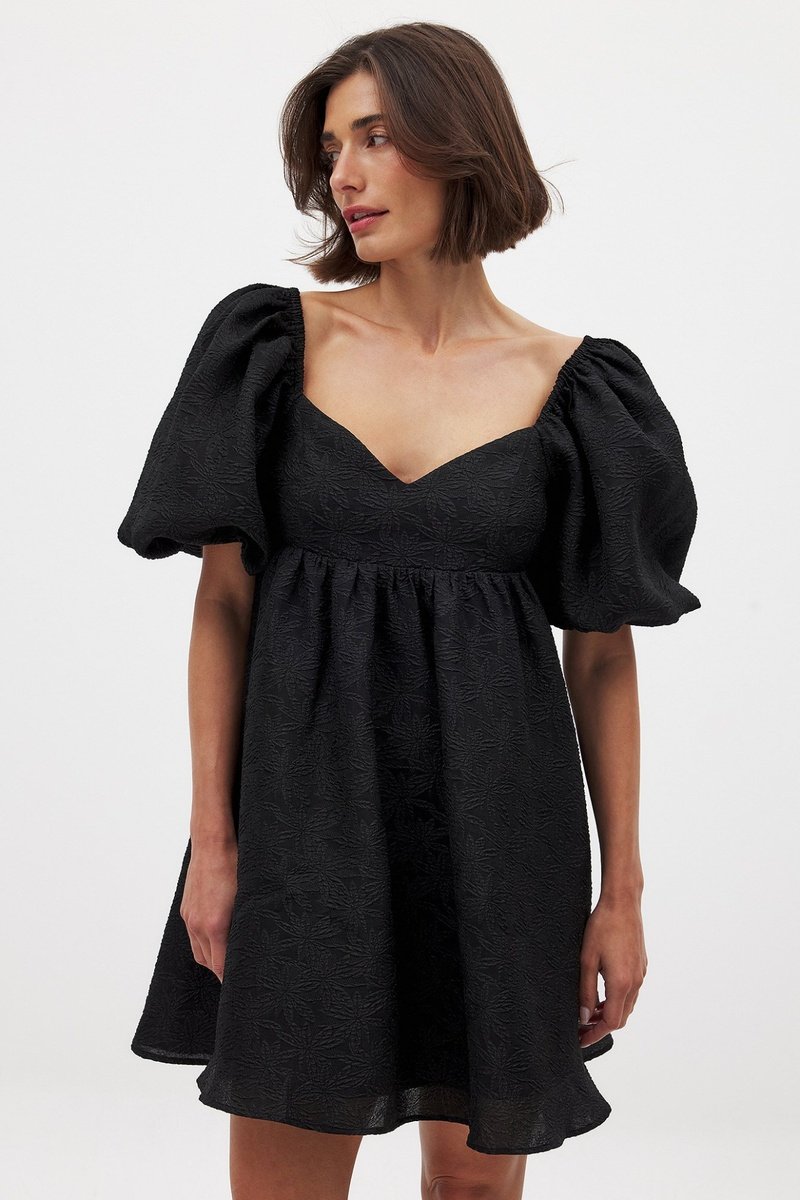 Abito a trapezio con maniche mezza lunghezza a palloncino.