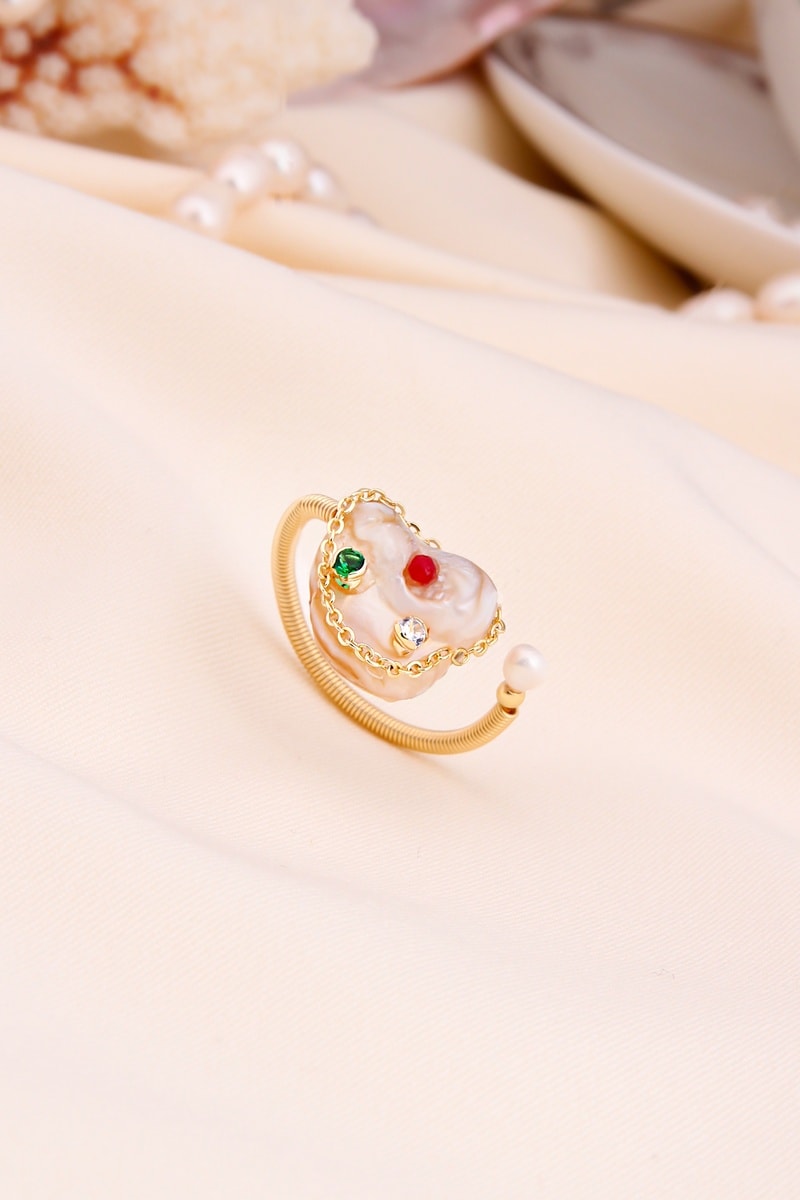 Anello regolabile placcato oro giallo con 3 zirconi e una perla di imitazione.