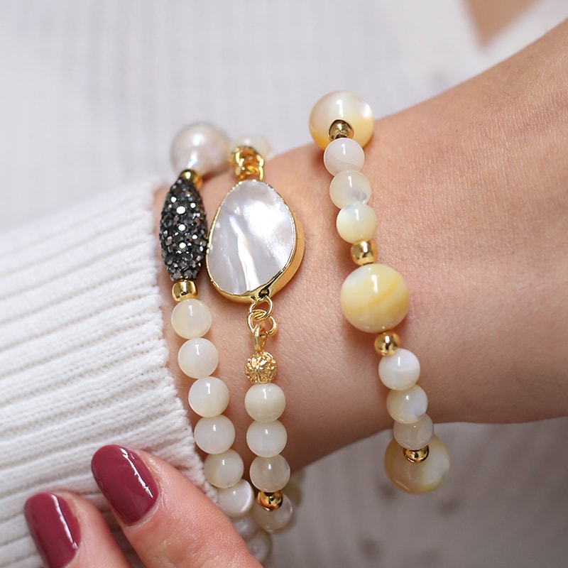 Lasciati sedurre da questo bracciale boho chic, che esalterà il tuo polso con un tocco di discreta raffinatezza. Adornato con perle delicate e madreperla, apporta un'eleganza luminosa che esalta ogni abito con grazia.