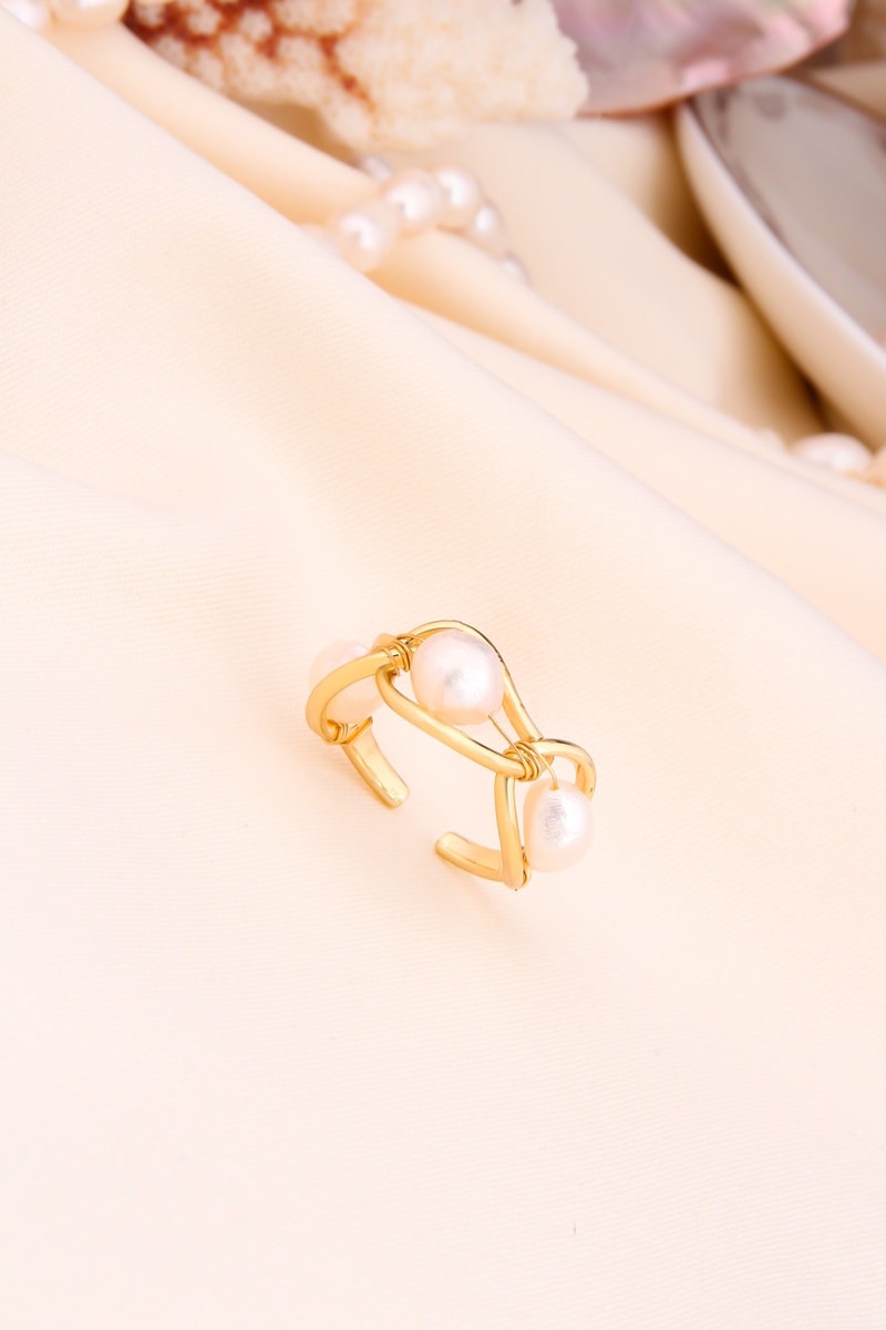 Anello regolabile placcato oro giallo con 3 perle di imitazione.