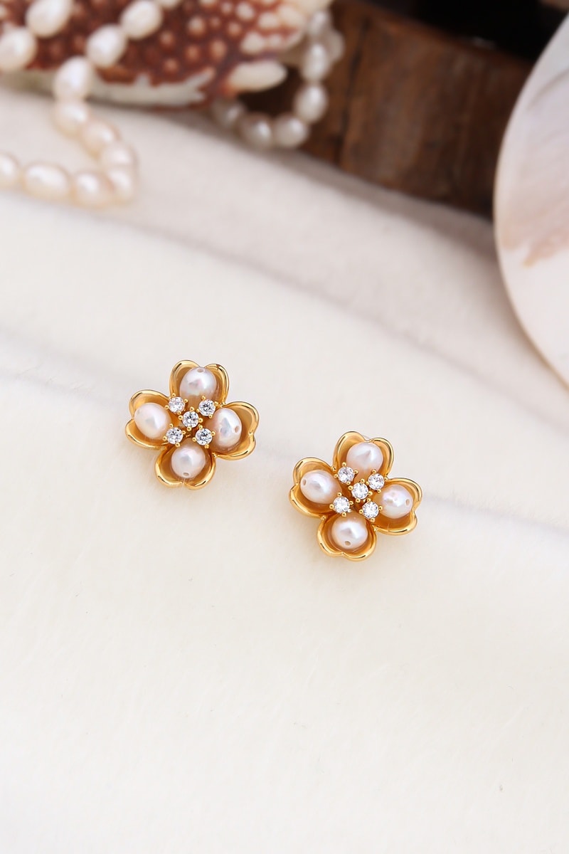 Orecchini con 4 zirconi e 4 perle di imitazione.