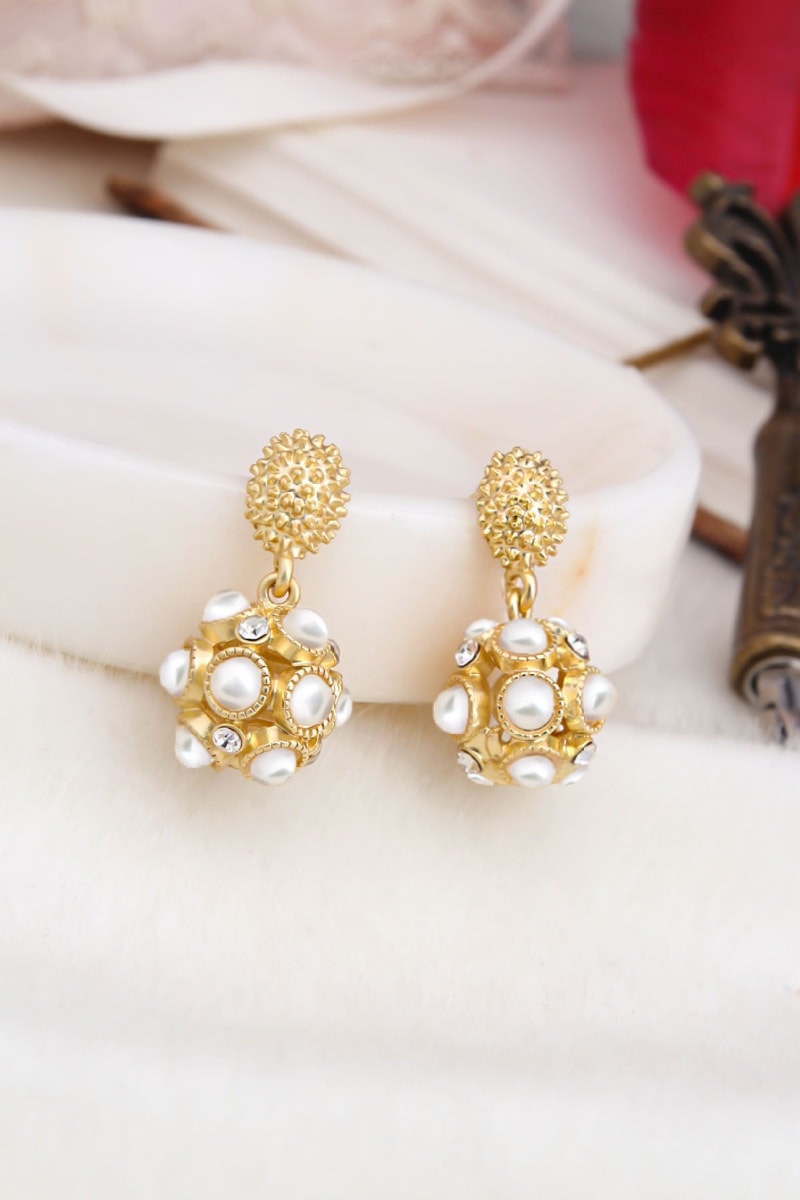 Orecchini pendenti placcato oro giallo con zirconi e perle di imitazione.