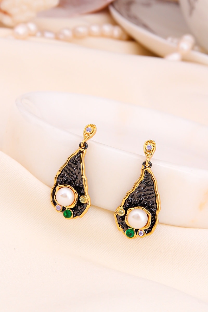 Orecchini pendenti placcato oro giallo con 4 cristalli e una perla di imitazione.