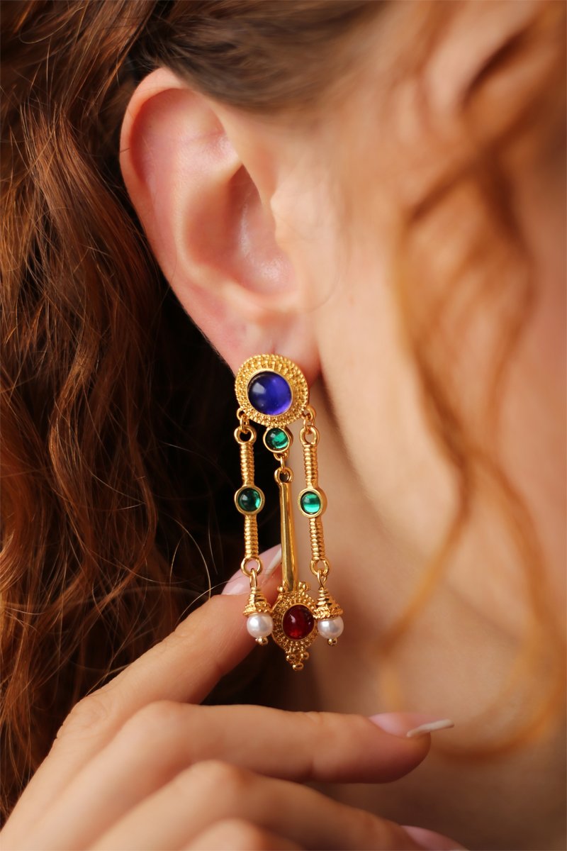 Orecchini laminato oro fino giallo con perle, lapislazzuli e malachiti.