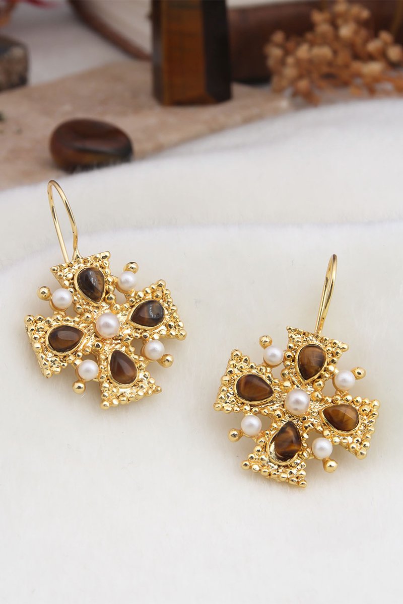 Orecchini placcato oro giallo con 4 occhi di tigre e perle di imitazione.