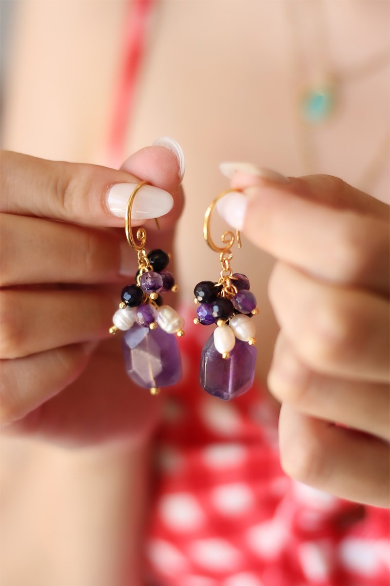 Orecchini pendenti laminato oro giallo con ametiste e perle di imitazione.
