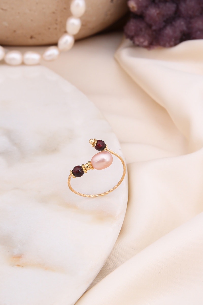 Anello regolabile con 2 agate e una perla di imitazione.