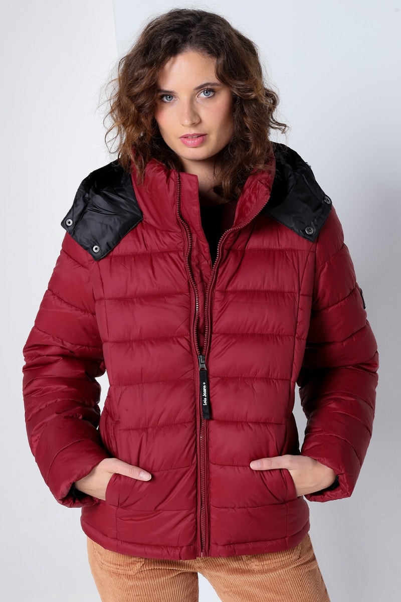 Piumino con cappuccio con coulisse, fermacorda e linguetta con chiusura automatica.